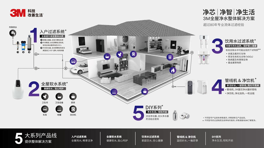 主要產(chǎn)品:3M全屋凈水解決方案(入戶過(guò)濾系統(tǒng)、全屋軟水系統(tǒng)、飲用水過(guò)濾系統(tǒng)、管線機(jī)和凈飲機(jī)、DIY產(chǎn)品)
