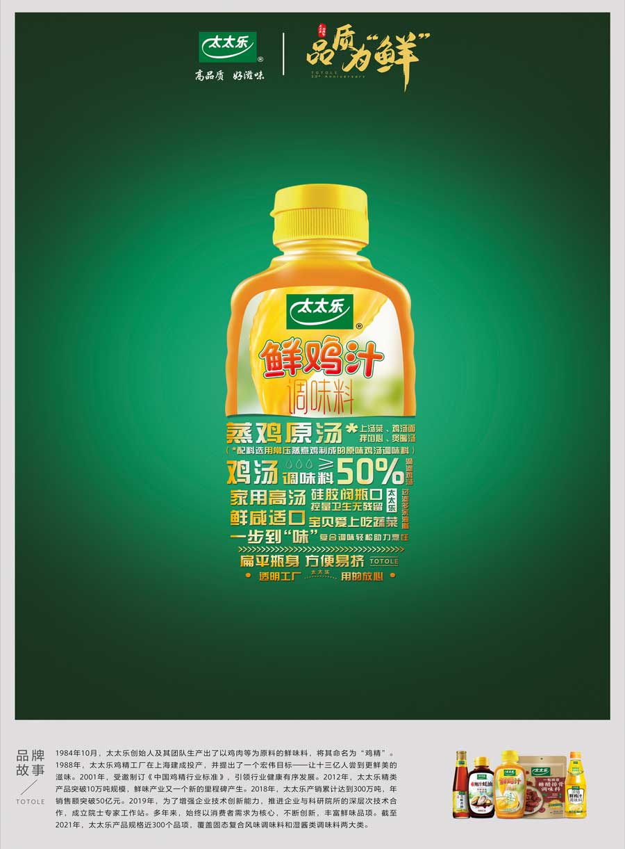 太太樂產(chǎn)品覆蓋固態(tài)復(fù)合風(fēng)味調(diào)味料和液態(tài)增鮮調(diào)味料兩大類的不同系列,多個(gè)子品牌,產(chǎn)品規(guī)格近300個(gè)品項(xiàng)。太太樂憑借雀巢體系的國際化管理體制、全球化質(zhì)量監(jiān)管體系、強(qiáng)大的研發(fā)實(shí)力和卓越的員工團(tuán)隊(duì),依托以餐飲、零售、電商、出口為主的四大銷售渠道,銷售網(wǎng)絡(luò)覆蓋全國各地,并出口至美國、加拿大、日本、中東等國家和地區(qū)。作為鮮味科學(xué)倡導(dǎo)者,太太樂以“讓十三億人嘗到更鮮美的滋味”為企業(yè)使命,持續(xù)鮮味行業(yè)革新升級(jí)。