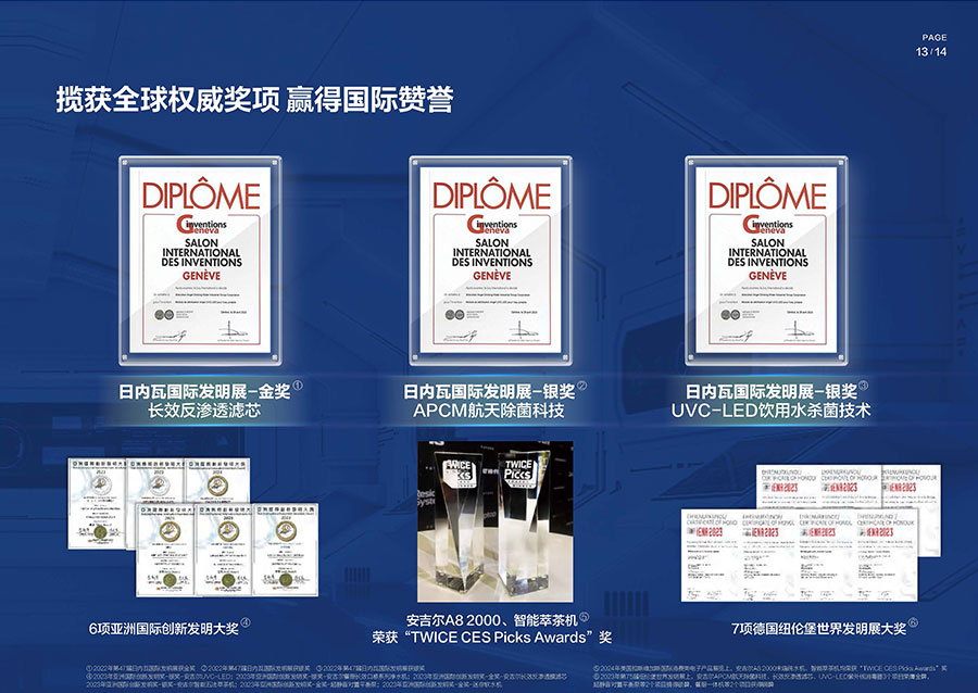 37年來,安吉爾始終堅(jiān)持科技創(chuàng)新,不斷引領(lǐng)行業(yè)技術(shù)升級。參與17項(xiàng)國家及行業(yè)標(biāo)準(zhǔn)制修訂,累計(jì)獲得900余項(xiàng)專利,建立4大水質(zhì)實(shí)驗(yàn)室。2023年,安吉爾憑實(shí)力斬獲全球9項(xiàng)發(fā)明獎(jiǎng),包含3項(xiàng)日內(nèi)瓦國際發(fā)明展獎(jiǎng)項(xiàng),6項(xiàng)亞洲創(chuàng)新發(fā)明展獎(jiǎng)項(xiàng)。
