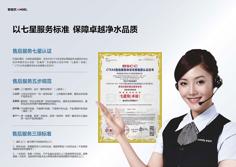 安吉爾擁有高標(biāo)準(zhǔn)的七星服務(wù)體系,服務(wù)覆蓋全國區(qū)縣2900+,全年每天24小時(shí)無間斷為用戶服務(wù),全面保障飲用水安全。
