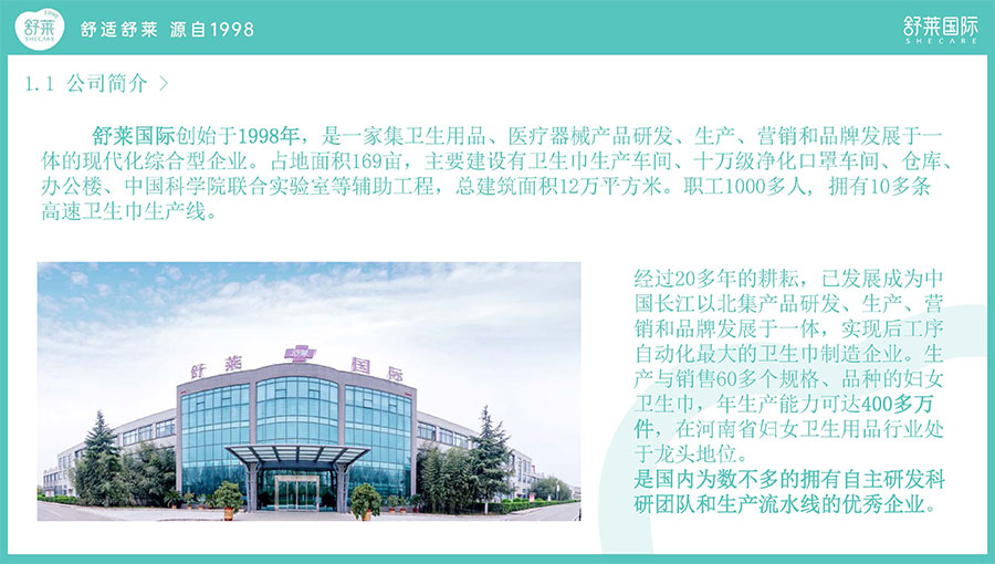 河南舒萊衛(wèi)生用品有限公司成立于1998年,位于許昌市襄城縣產(chǎn)業(yè)集聚區(qū),是一家集自主研發(fā)、生產(chǎn)、銷(xiāo)售及服務(wù)于一體的中原地區(qū)及周邊省份最大的婦女衛(wèi)生巾和婦女衛(wèi)生護(hù)墊的專(zhuān)業(yè)生產(chǎn)企業(yè)。舒萊嚴(yán)格按照現(xiàn)代化企業(yè)管理模式運(yùn)行,實(shí)行董事會(huì)領(lǐng)導(dǎo)下的總經(jīng)理全面負(fù)責(zé)制,建立健全各項(xiàng)規(guī)章制度和質(zhì)量保證體系。