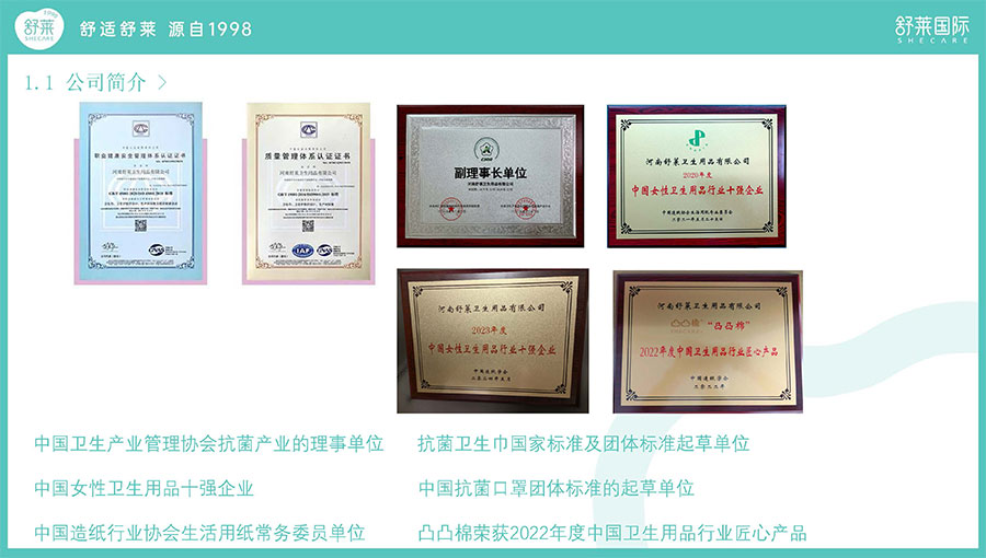 2021年5月,被中國(guó)造紙協(xié)會(huì)生活用紙專(zhuān)業(yè)委員會(huì)評(píng)定為“2020年度中國(guó)女性衛(wèi)生用品行業(yè)十強(qiáng)企業(yè)”;