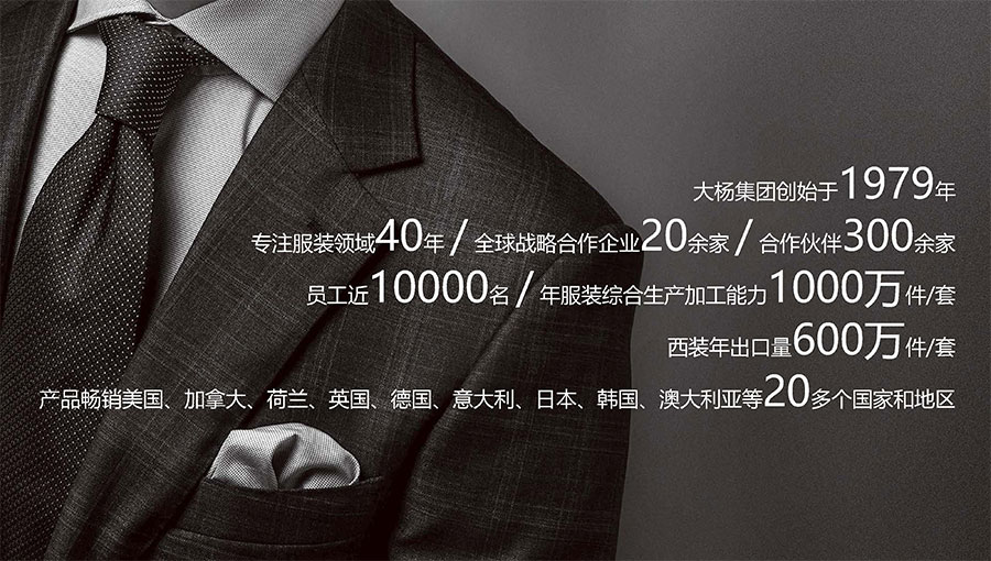 目前,大楊集團(tuán)全球營銷網(wǎng)絡(luò)已遍布美國、加拿大、荷蘭、英國、澳大利亞及日本等27個國家和地區(qū),開設(shè)單裁合作店面上千家,與加拿大互聯(lián)網(wǎng)定制巨頭Indochino公司、澳大利亞知名男裝定制企業(yè)Institchu公司、美國服裝巨頭TBI公司簽署戰(zhàn)略合作協(xié)議,年定制產(chǎn)品數(shù)量已突破200萬件/套,具備西裝、襯衫、休閑裝以及大衣、風(fēng)衣等全品類定制生產(chǎn)能力。