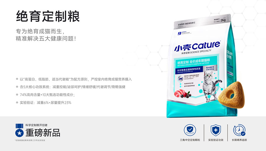 主要產(chǎn)品:小殼絕育定制糧,小殼皮膚毛發(fā)定制糧,小殼免疫呵護定制糧,小殼功能主食罐系列(小殼排毛主食罐,小殼魚油主食罐),小殼小輕松凍干棒系列(小殼貓草棒pro,小殼魚油棒pro)