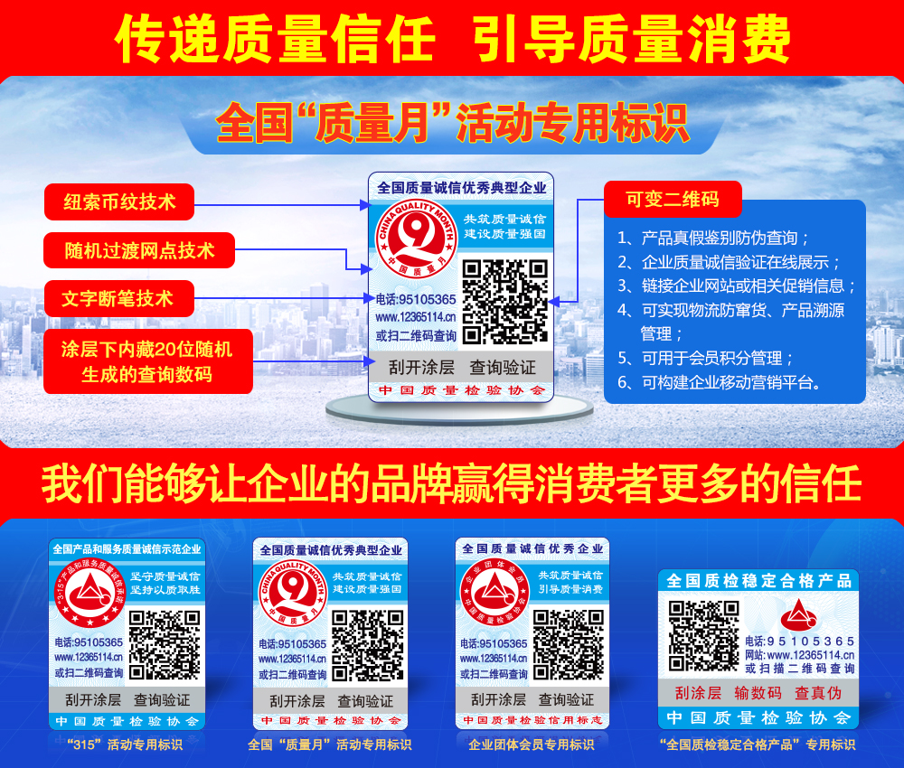 中國(guó)質(zhì)量檢驗(yàn)協(xié)會(huì)防偽溯源和物流管理服務(wù)系統(tǒng)(簡(jiǎn)稱中檢聯(lián)合質(zhì)量誠(chéng)信驗(yàn)證系統(tǒng))是以物聯(lián)網(wǎng)、大數(shù)據(jù)、云計(jì)算、區(qū)塊鏈和移動(dòng)互聯(lián)網(wǎng)技術(shù)為基礎(chǔ)建設(shè)的全過(guò)程防偽溯源與質(zhì)量誠(chéng)信驗(yàn)證服務(wù)平臺(tái),依托廣大技術(shù)機(jī)構(gòu)的技術(shù)支撐,應(yīng)用二維碼為載體,使用一物一碼防偽技術(shù),同時(shí)采用文字、圖片和視頻等多媒體方式,完整記錄產(chǎn)品的原料來(lái)源、生產(chǎn)加工、倉(cāng)儲(chǔ)物流和市場(chǎng)銷售等詳細(xì)信息,融合實(shí)現(xiàn)產(chǎn)品質(zhì)量來(lái)源可查、去向可追、責(zé)任可究的全過(guò)程追溯,切實(shí)方便企業(yè)履行質(zhì)量安全主體責(zé)任并用科技、智能化、信息化的手段去加強(qiáng)質(zhì)量安全風(fēng)險(xiǎn)控制,維護(hù)消費(fèi)者合法權(quán)益,讓人民群眾買得放心、吃得放心、用得放心...