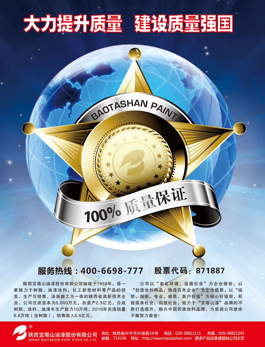 陜西寶塔山油漆股份有限公司始建于1958年,公司生產(chǎn)基地位于歷史文化名城陜西省興平市,是一家致力于樹脂、油漆涂料、化工新型材料等產(chǎn)品的研發(fā)、生產(chǎn)與銷售、涂裝施工為一體的陜西省高新技術(shù)企業(yè)。憑借近60年的不懈努力,在合成樹脂、醇酸漆、民用建筑涂料、工業(yè)用防腐涂料、特種涂料等方面技術(shù)成熟,成為我國涂料領(lǐng)域的優(yōu)秀民族品牌。近年來,公司始終堅持高科技、高品質(zhì)的技術(shù)發(fā)展戰(zhàn)略,時刻關(guān)注市場需求,不斷創(chuàng)新,致力于客戶成功,在工業(yè)防腐涂料、建筑涂料等環(huán)保涂料以及軍工等特種功能涂料方面,突破傳統(tǒng)工藝、引用前沿新技術(shù)、新材料、引領(lǐng)綠色涂料新變革,為消費者帶來更環(huán)保、更安全、更高科技含量的產(chǎn)品和貼心的服務(wù)。