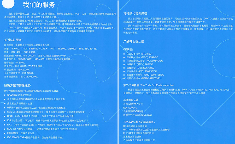 作為一家世界領(lǐng)先的提供管理服務的國際機構(gòu),DNV GL通過為客戶提供認證、驗證、評估和培訓服務,確保客戶在組織、產(chǎn)品、人員、設(shè)施以及供應鏈管理方面取得卓越的業(yè)績。我們始終與客戶通力合作,幫助客戶構(gòu)建一個業(yè)務可持續(xù)發(fā)展的平臺,并贏得利益相關(guān)方的信任。
