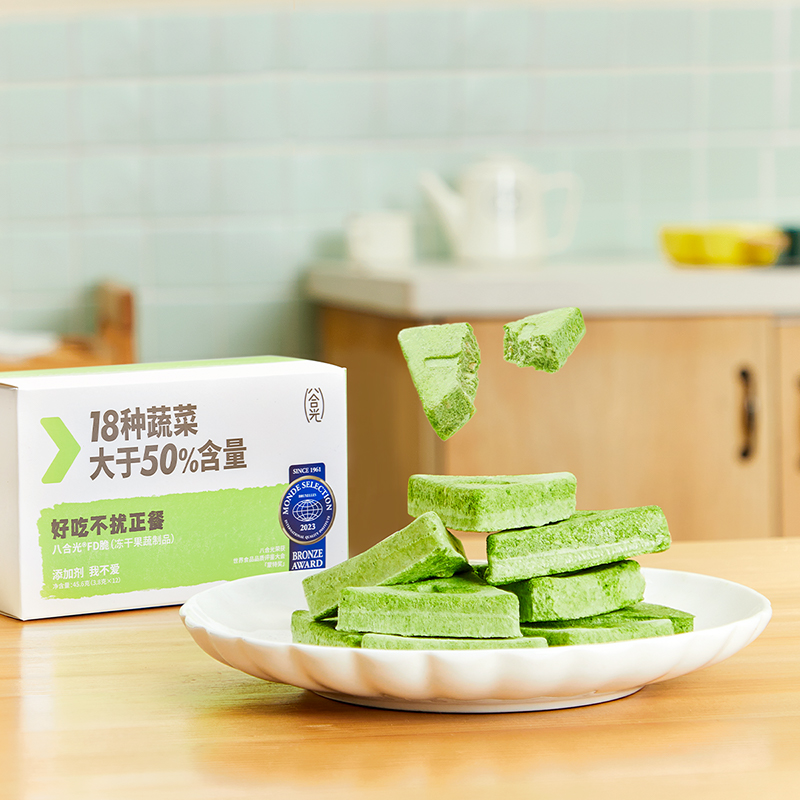 隨著育兒觀念、消費意識的轉(zhuǎn)變,新生代父母在兒童零食上,不僅看重天然健康,還要對孩子身體的成長發(fā)育有益。為了滿足這屆父母對兒童零食的新需求,2022年底,八合光兒童零食品牌率先推出了一款含有“18種蔬菜”的蔬菜凍干機能零食——八合光FD脆。