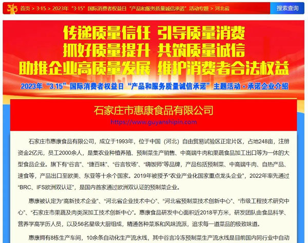 傳遞質(zhì)量信任,引導(dǎo)質(zhì)量消費(fèi),近日,由中國質(zhì)量檢驗(yàn)協(xié)會主辦的2023年3·15國際消費(fèi)者權(quán)益日“產(chǎn)品和服務(wù)質(zhì)量誠信承諾”主題活動順利召開。在本次活動中,石家莊市惠康食品有限公司憑借優(yōu)質(zhì)的產(chǎn)品質(zhì)量及誠信經(jīng)營榮膺“全國產(chǎn)品和服務(wù)質(zhì)量誠信示范企業(yè)”,““全國預(yù)制菜行業(yè)質(zhì)量領(lǐng)先企業(yè) ”,公司旗下谷言預(yù)制菜系列產(chǎn)品榮獲“全國消費(fèi)者質(zhì)量信譽(yù)保障產(chǎn)品”榮譽(yù)。為營造公平、公正、誠信經(jīng)營的市場環(huán)境,樹立質(zhì)量標(biāo)桿、弘揚(yáng)質(zhì)量先進(jìn)做出了表率作用。