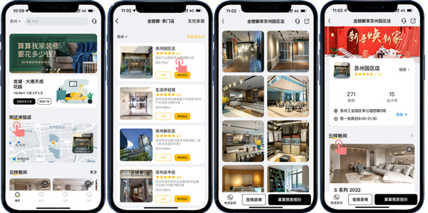 目前,金螳螂家在全國擁有150家門店,客戶可以通過“附近體驗店”選擇客戶所在城市的服務(wù)門店,在這里可以了解到該門店的720度VR全景樣板間、案例、設(shè)計師以及客戶的真實評價,不用出門探訪實體門店,就能快速了解門店情況,省時又省力!