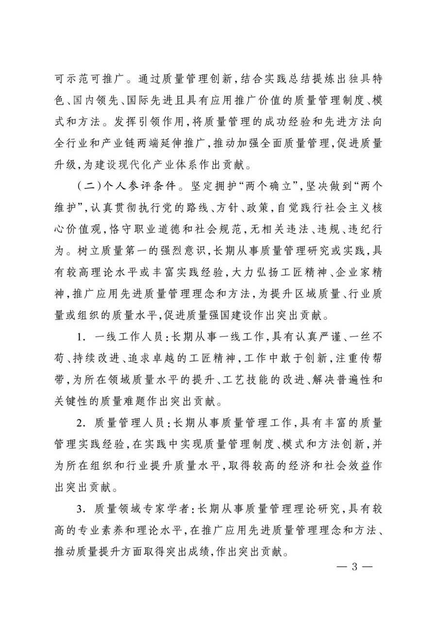 (二)參評(píng)個(gè)人范圍。包括各行業(yè)領(lǐng)域一線工作人員,各類組織質(zhì)量管理人員,質(zhì)量領(lǐng)域?qū)<覍W(xué)者等。