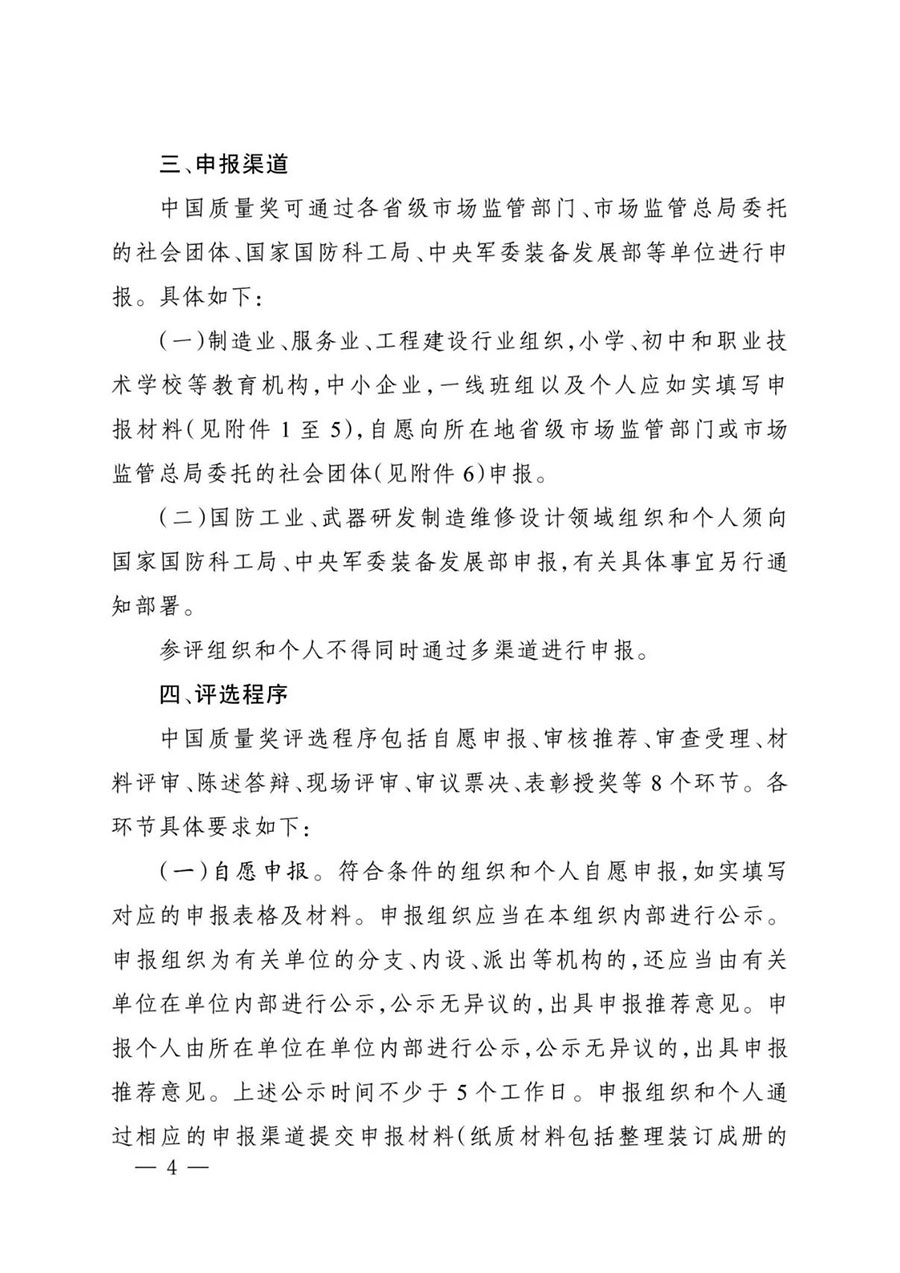 (三)審查受理。對(duì)申報(bào)材料進(jìn)行形式審查,并征求有關(guān)主管部門意見后,形成中國質(zhì)量獎(jiǎng)受理名單,向社會(huì)公示。形式審查和征求意見過程中需要參評(píng)組織或個(gè)人進(jìn)一步補(bǔ)充資料或就有關(guān)情況作出說明的,參評(píng)組織或個(gè)人應(yīng)在規(guī)定時(shí)間內(nèi)提供相關(guān)材料。對(duì)未通過審查和公示的申報(bào)組織及個(gè)人,退回申報(bào)材料并說明理由。