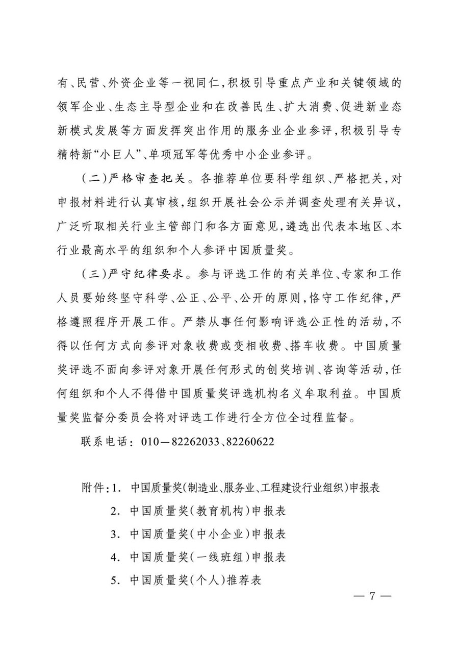 審核推薦材料(包括紙質(zhì)版及電子版光盤或U盤)寄至中國質(zhì)量獎(jiǎng)評(píng)選表彰委員會(huì)秘書處(地址:北京市東城區(qū)安定門外大街56號(hào),市場監(jiān)管總局質(zhì)量發(fā)展局質(zhì)量管理處;郵編:100011),電子版材料同時(shí)發(fā)送至zgzlj@samr.gov.cn,郵件標(biāo)題為“推薦單位名稱+聯(lián)系人+手機(jī)號(hào)碼”。審核推薦材料包括:推薦函、推薦名單匯總表(見附件8)、申報(bào)材料。材料接收時(shí)間截止至6月19日。