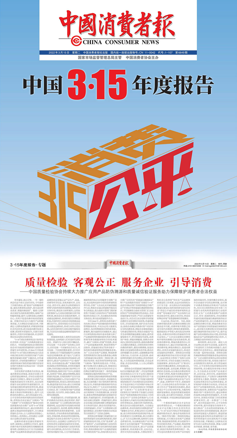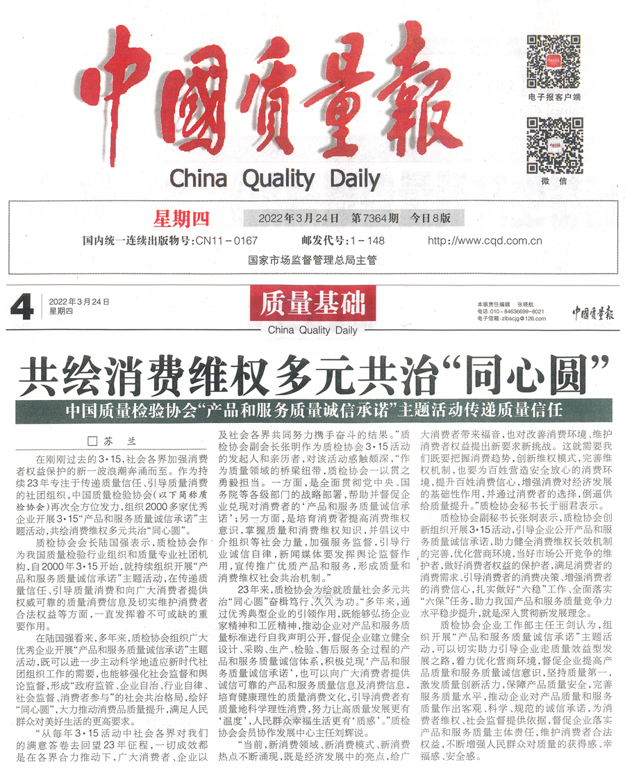 中國質(zhì)量報(3月15日刊第2版):推動質(zhì)量共治 優(yōu)化營商環(huán)境 共筑質(zhì)量誠信——中國質(zhì)量檢驗協(xié)會攜手2000余家企業(yè)組織開展“3 ·15”產(chǎn)品和服務(wù)質(zhì)量誠信承諾主題活動