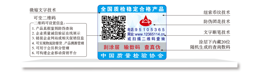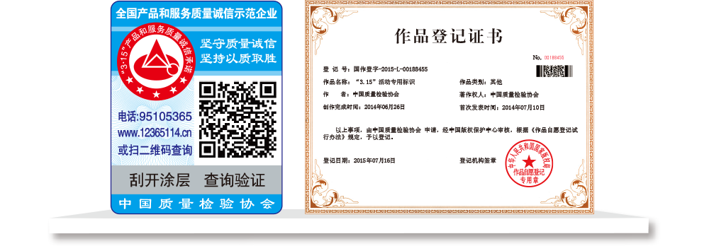 【“全國(guó)質(zhì)檢穩(wěn)定合格產(chǎn)品”專用標(biāo)識(shí)】具有專屬的知識(shí)產(chǎn)權(quán)(經(jīng)中國(guó)版權(quán)保護(hù)中心審核,國(guó)家版權(quán)局對(duì)“全國(guó)質(zhì)檢穩(wěn)定合格產(chǎn)品”專用標(biāo)識(shí)頒發(fā)了《作品登記證書》,登記號(hào):國(guó)作登字-2015-L-00188456),集電話電碼防偽查詢、二維碼在線掃描、微信驗(yàn)證等多種功能于一體,綜合運(yùn)用了紐索幣紋、微縮文字、熒光激發(fā)油墨等多種防偽技術(shù);加貼在產(chǎn)品或包裝上,消費(fèi)者只需要用座機(jī)(手機(jī))電話撥打全國(guó)范圍內(nèi)都不需要加區(qū)號(hào)的特服號(hào)碼95105365或使用手機(jī)掃描二維碼或登陸網(wǎng)站(http://www.12365114.cn)就可直接查詢驗(yàn)證加貼專用標(biāo)識(shí)的產(chǎn)品為本協(xié)會(huì)調(diào)查匯總證明的全國(guó)質(zhì)量檢驗(yàn)穩(wěn)定合格產(chǎn)品,助力企業(yè)通過“質(zhì)量檢驗(yàn)”的比較優(yōu)勢(shì)去贏得消費(fèi)者更多的信任。